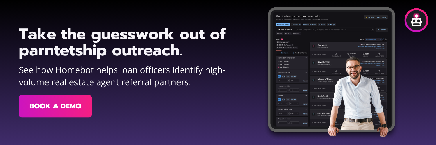 Homebot helps loan officers put this into practice by automating the monthly touchpoints that keep past clients engaged, surfacing behavioral signals that show who's ready to make a move, and giving you co-sponsorship tools that make agent partnerships more valuable for both sides. If you want to see what that looks like for your specific database and market:
